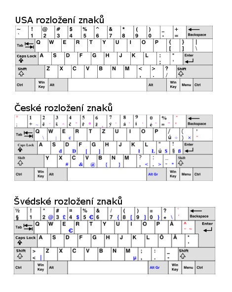 Odhadem asi 90% prodávaných počítačů má vždy cizojazyčnou klávesnici. Platí to o všech noteboocích které nejsou výslovně označené v naší nabídce tak, že mají "originál CZ klávesnici". Tuto informaci buď neuvádíme vůbec, nebo je uvedena v parametrech produktu. Jaká konkrétní lokalizace to je, neuvádíme záměrně. Zákazníkovi by to příliš neřeklo a ve většině případů je klávesnice shodná s EN/US rozložením kláves. Takže odlišnost je jen pro klávesy s diakritikou a pár dalších. Pro porovnání naleznete níže obrázek rozložení americké, české a švédské klávesnice. Jak je vidět, rozdíly jsou minimální a naprostou většinu často používaných kláves nalezneme na stejném místě.