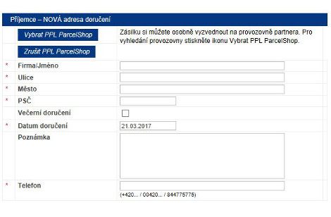 - Možnost doručení do výdejních míst PPL Parcelshop nebo Parcelbox (mapa míst).