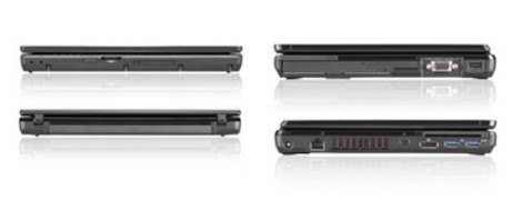 Zbývající konektory jsou v přední části Fujitsu Lifebook P772. Jmenovat lze čtečku paměťových karet SD a zdířku pro mikrofon a sluchátka. Zadní část je z praktických důvodů naprosto holá.